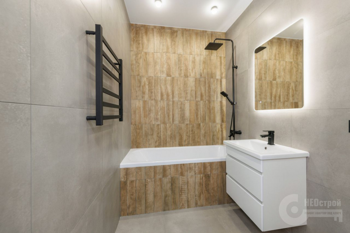 - Облицовка пола и стен в ванной комнате и туалете керамогранитом и керамической плиткой увеличенных форматов из новейших современных решений с применением разных форматов, текстур и тонов с зонированием пространства