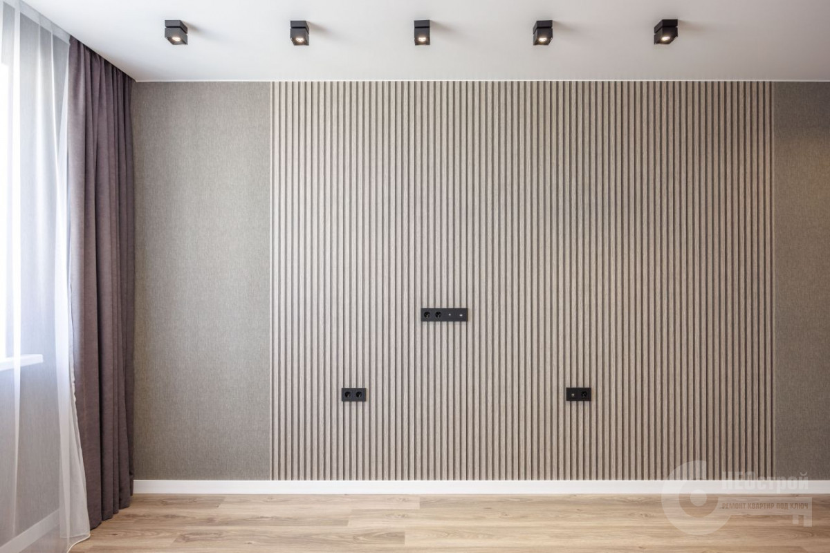 - Оформление зоны ТВ в гостиной стеновыми 3D панелями с покраской в нужный тон