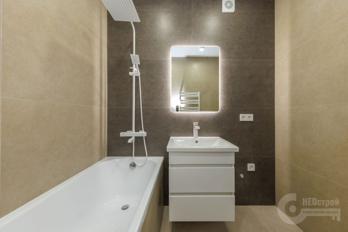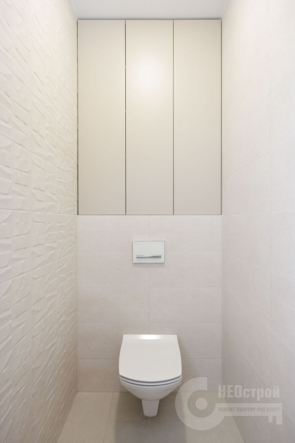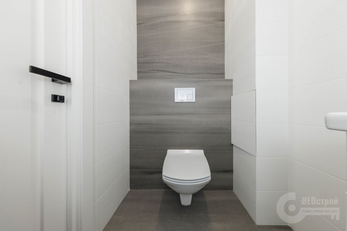 - Облицовка пола и стен в ванной комнате и туалете крупноформатным керамогранитом и керамической плитой 60х120 см из новейших современных решений с сочетанием разных форматов, текстур и тонов с зонированием пространства